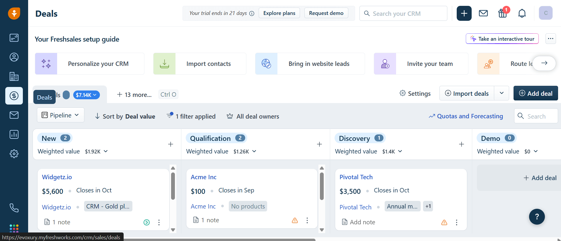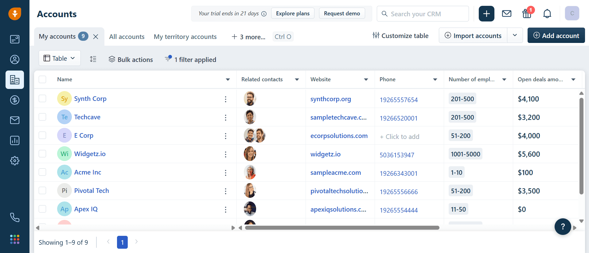 Freshsales offers a 21-day free trial of all its paid plans and a free plan that supports up to three users, making it perfect for startups that are testing free CRM systems. Freshsales offers three paid tiers: Growth, Pro and Enterprise. The Growth plan is the sweet spot for most small businesses, thanks to its affordable pricing and AI-powered CRM features.