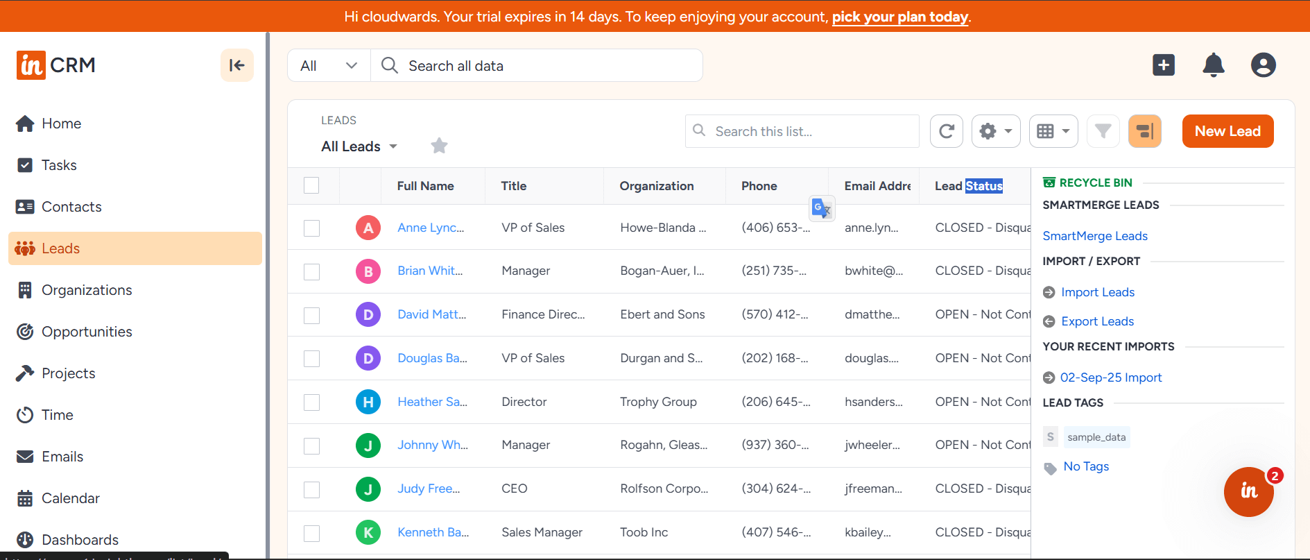 Vtiger merges CRM tools with project management and customer service features. Its greatest strengths lie in its customization and adaptability. Vtiger lets you mold the platform to your unique workflow, making it a powerful tool for small businesses.