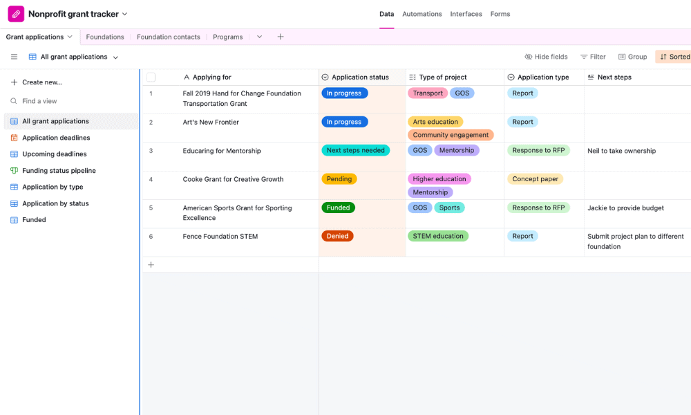 Airtable is structured like a spreadsheet or database, which makes it highly intuitive to use. You can manage multiple projects as well as data about donors, beneficiaries and grants. Nonprofits can apply for a 50% discount on the Team plan.
