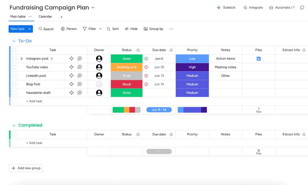 monday.com is a flexible project management tool for nonprofits. It adapts easily to varied needs, such as event planning, peer-to-peer fundraising or even tracking social media posts. monday.com also streamlines collaboration and helps teams improve productivity.