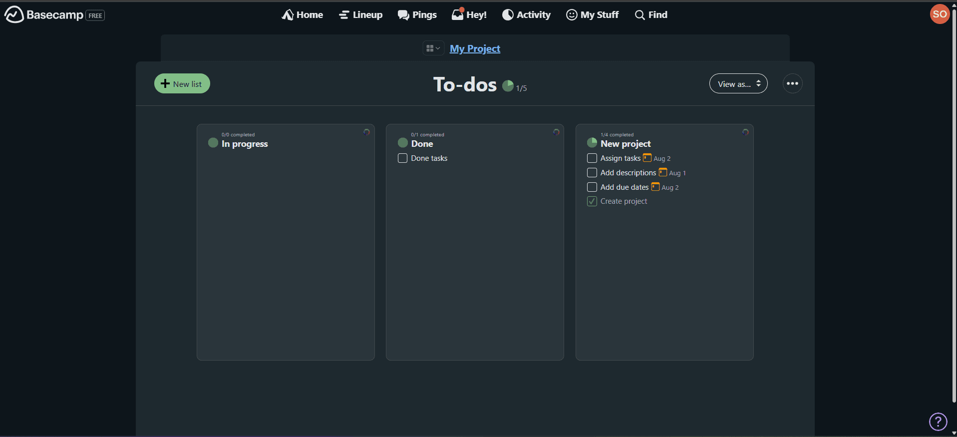 Basecamp is the perfect tool for teams who want built-in messaging, file transfers and scheduling options all in one simple dashboard. Basecamp proposes a different UI to visualize your projects. Even though it’s not as feature-heavy as Trello or other alternatives like ClickUp or monday.com, it’s easy to use and great for small teams. Check out our Basecamp review if it sounds like the right fit.
