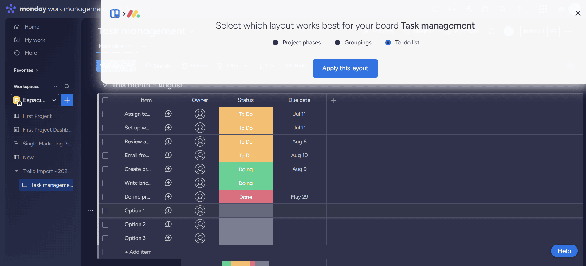 In order to import your boards correctly, you’ll have to customize your visualization in monday.com. The platform lets you choose your desired layout between project phases, groupings and to-do lists. Click “apply layout” when you’re ready.
