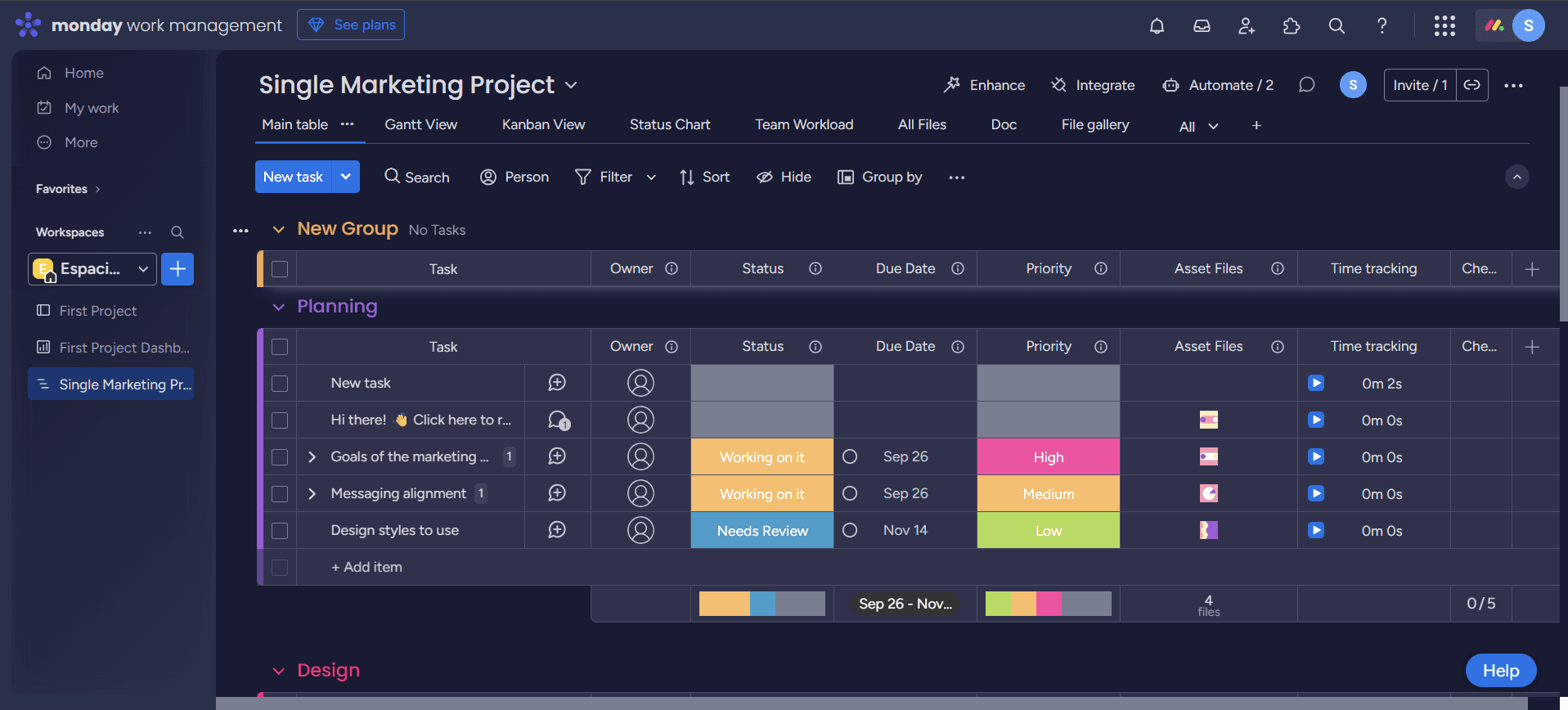 Available views: As your team grows, you’ll need more advanced views. The workload view, Gantt charts and reports are great for visualizing different aspects of the same project.