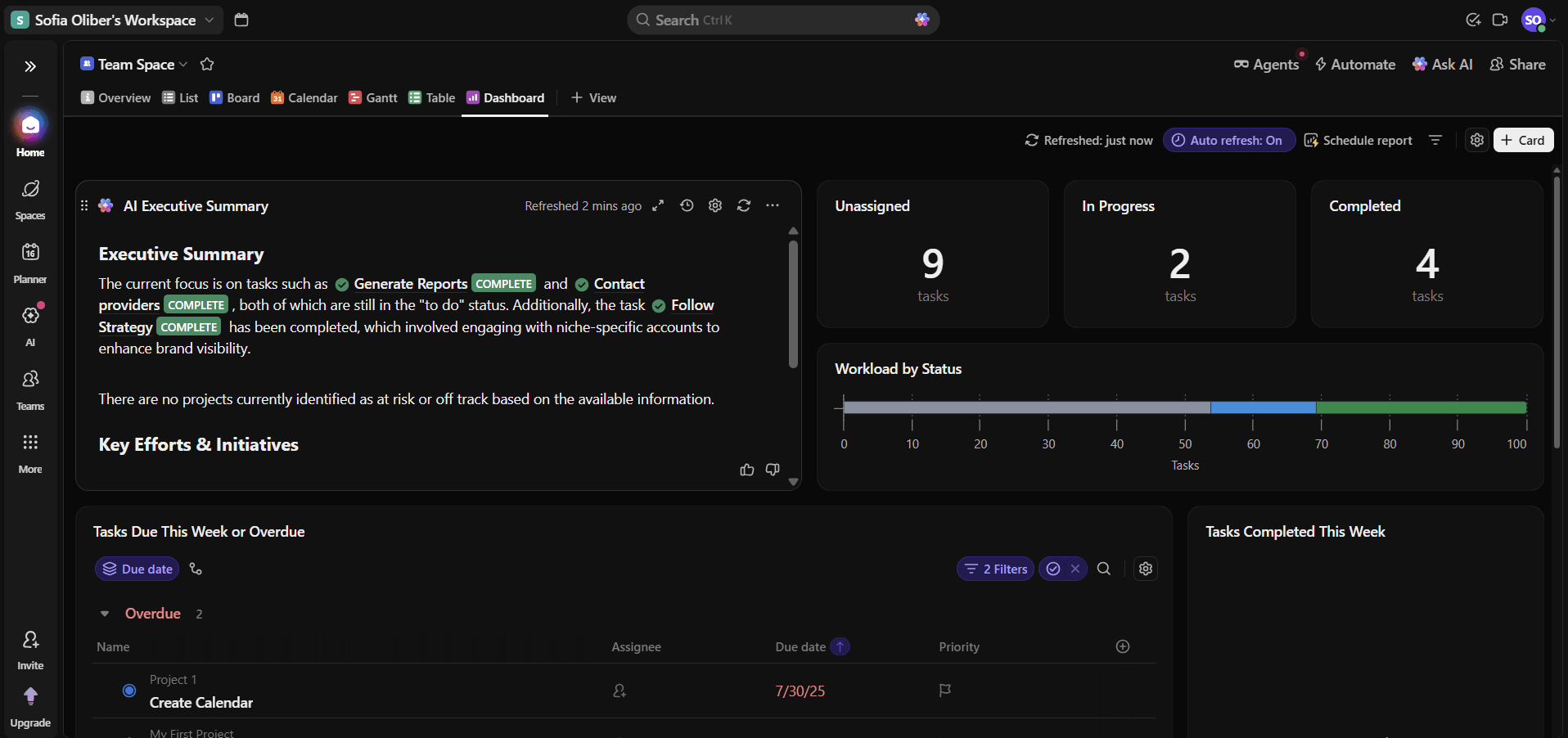ClickUp is a platform with 16 view options, including list, boards, Gantt, calendar and workload, plus customizable dashboards with drag-and-drop widgets. However, the sheer number of features and configuration options creates a steep learning curve, which can make the interface feel cluttered and overwhelming.