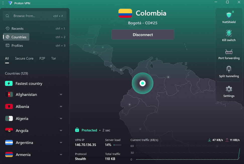 Proton VPN offers a simpler interface that may appeal to new users looking for straightforward protection against Colombian government surveillance, or “ciberpatrullaje.”