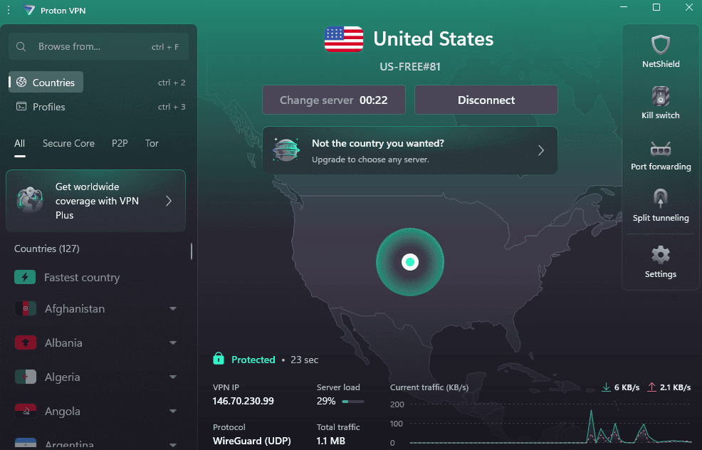 The free plan understandably comes with a few restrictions. You get unlimited data, but after using 10GB you’re switched to the “Lite” plan — this has slower speeds and auto-connects you to the best available server, rather than letting you choose.