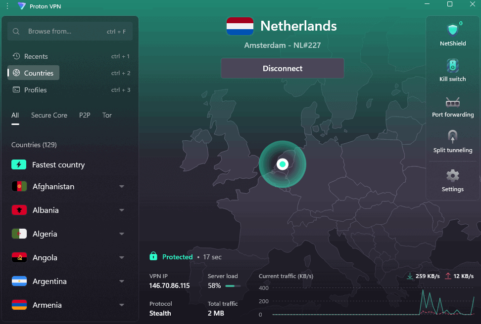 Proton VPN’s Secure Core feature routes traffic through privacy-friendly countries like Switzerland before connecting to the destination server. This adds an extra layer of protection, which is especially valuable for users in the Netherlands given the country’s membership in the 14 Eyes Alliance. Combined with Stealth for obfuscation, Proton VPN offers strong tools for staying anonymous online.