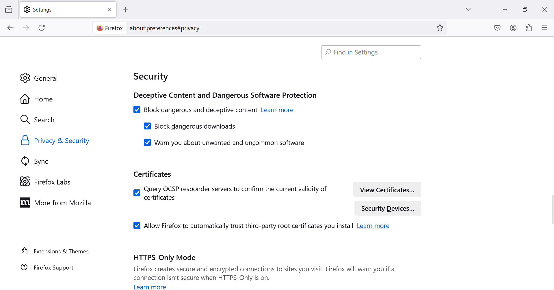 We recommend activating Firefox’s HTTPS-only mode if you’re using public WiFi. HTTPS websites use secure, encrypted connections. Enabling HTTPS-only mode forces all connections to use HTTPS, and it will alert you if a website connection isn’t secure. This feature is comparable to those offered by the most secure web browsers.