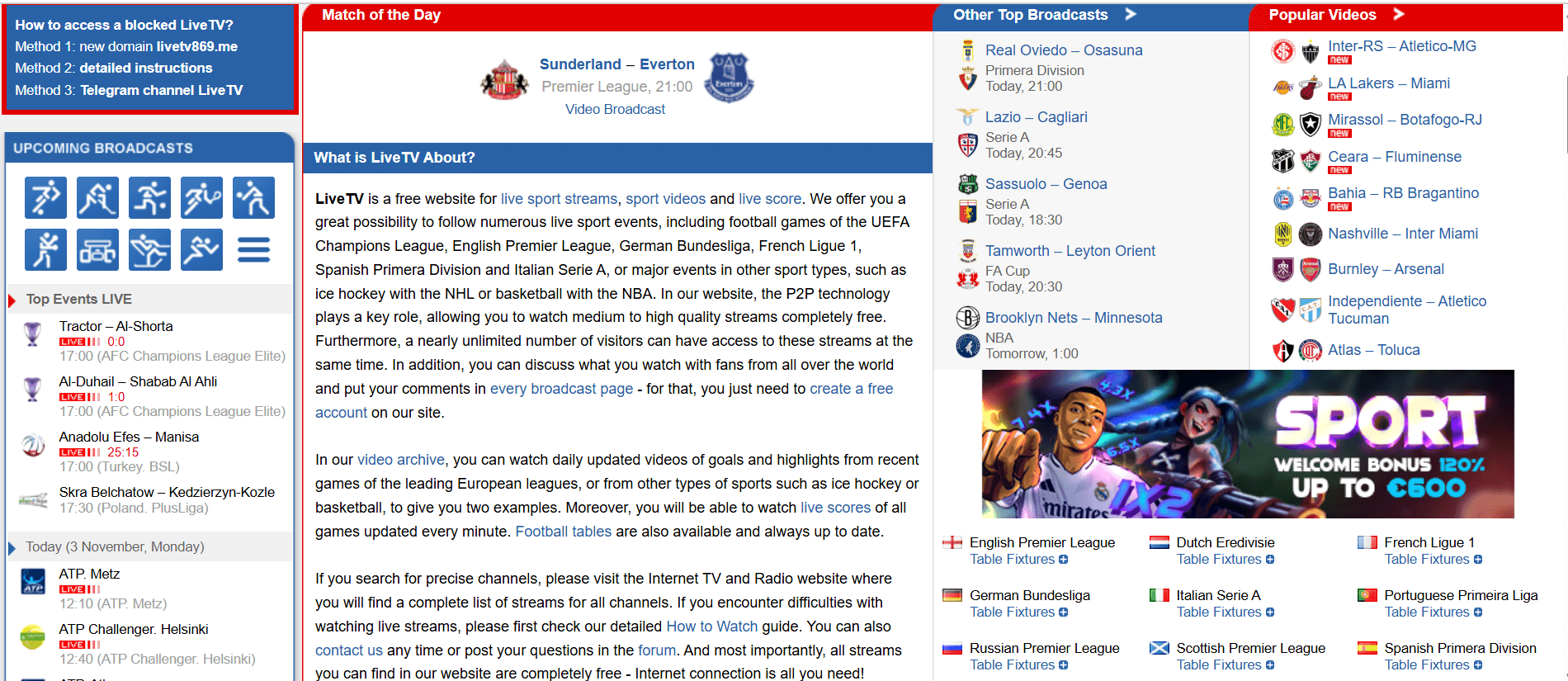 LiveTV is the best Footybite replacement, thanks to its wide sports coverage. I saw match links for major and niche sports, including soccer, tennis, ice hockey and racing. LiveTV has multiple links for each game, in case your preferred link fails. It also introduces new domains periodically, which is ideal for downtime and copyright takedowns.