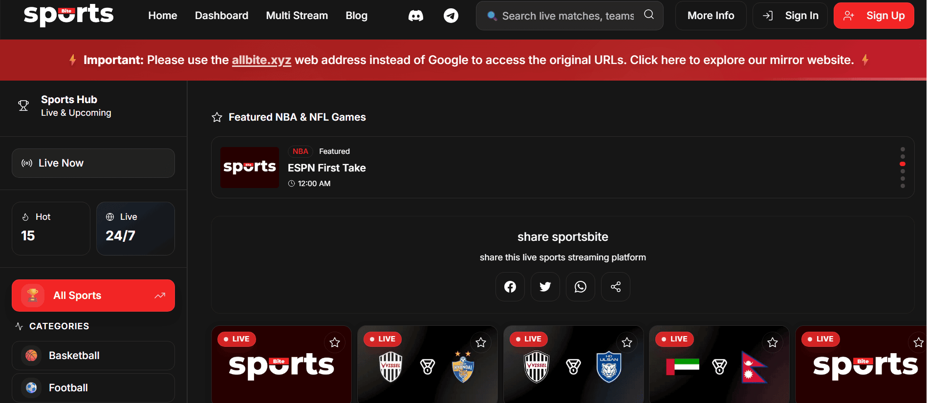 SportsBite is another useful Footybite alternative with plenty of HD streams. It covers many sports, including soccer, hockey and tennis. SportsBite’s interface is well organized, making it easy for users to find live and upcoming streams.