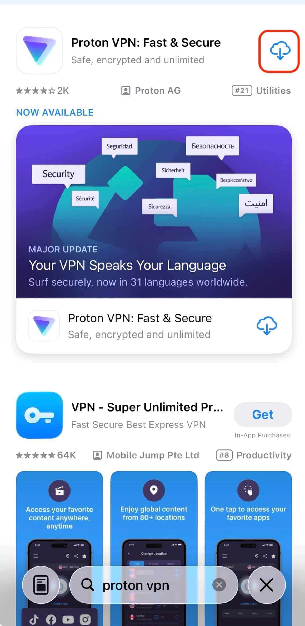 Go to the Apple app store and use the search bar to find the VPN — in this case, Proton VPN. Click on the “get” button or “install” icon by the VPN to download and install it on your device. Alternatively, visit the VPN’s download page and find its iOS client.