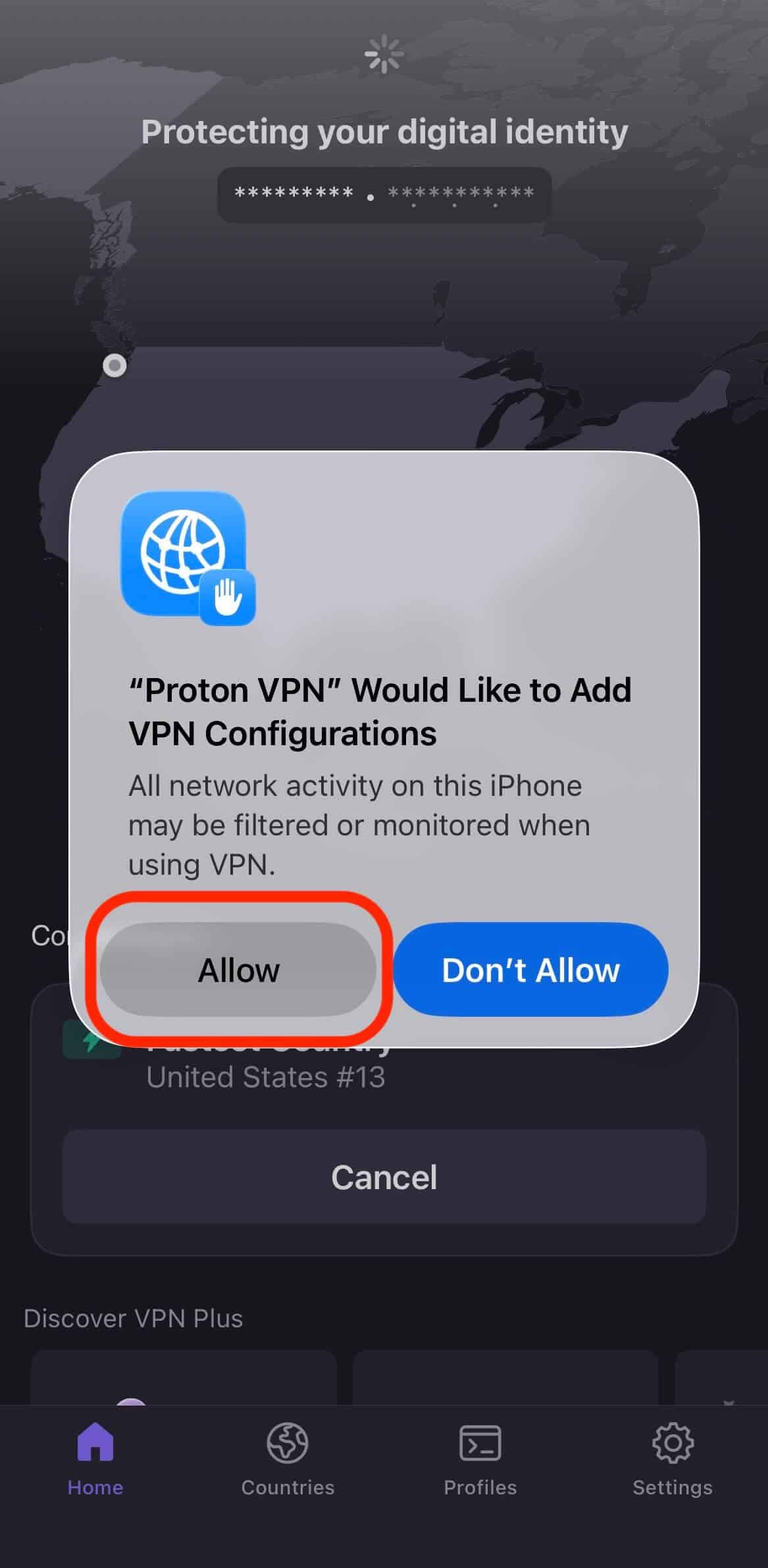 If it’s your first time connecting the VPN, you will need to give permission for the VPN to add configurations to your iPhone. (This is an iPhone security feature that makes sure you know you’re allowing the app to become a primary network interface to route your internet connection through its encrypted channel when connected.) Click “allow.”