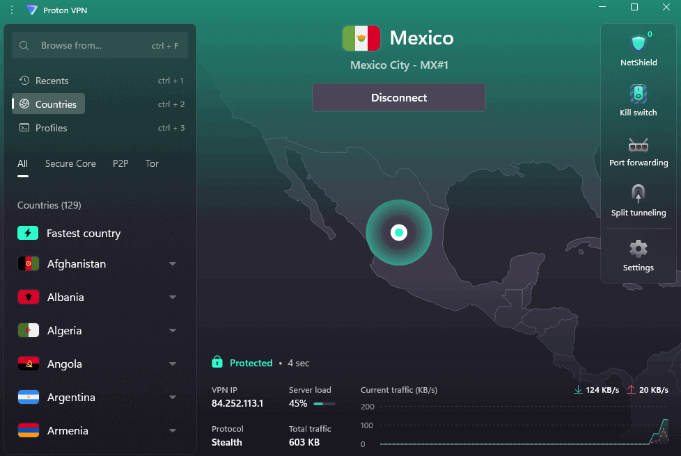 Proton VPN includes Mexican servers on its unlimited-data free plan, but free users can’t pick their server connection; instead, the VPN connects to the best server for you, so there’s a chance you’ll skip Mexico. If you want to control your server connection, you’ll need a paid plan, starting at $2.99 per month. Read our Proton VPN review for more details.