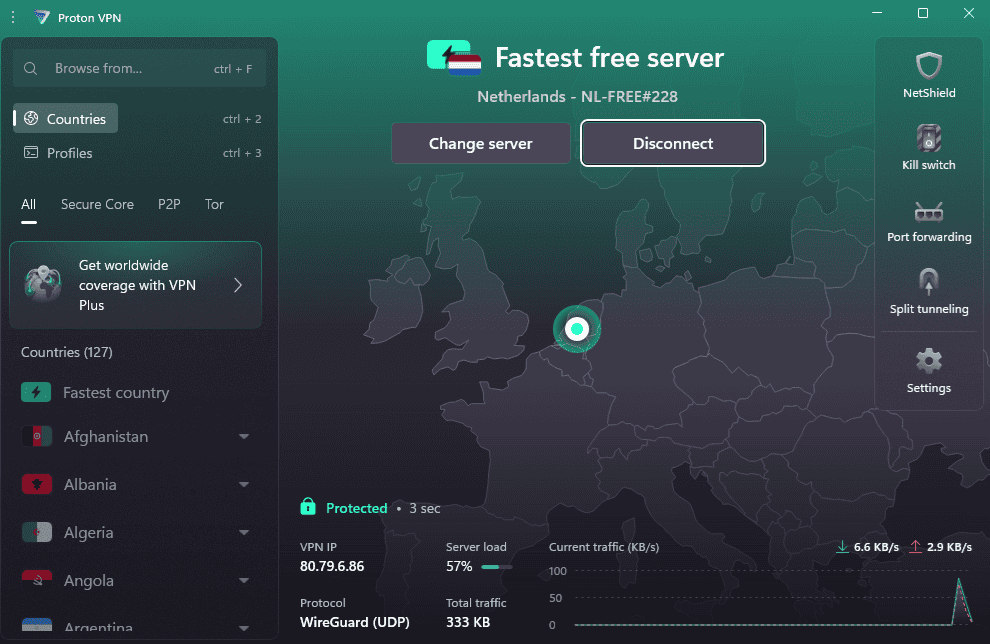 On the subject of privacy, Proton VPN’s Secure Core feature routes your traffic through countries with strict privacy laws like Switzerland and Iceland before reaching the VPN server, adding an extra layer of protection when accessing geo-restricted UFC content. The service also includes NetShield, which blocks ads and trackers during your streaming sessions.