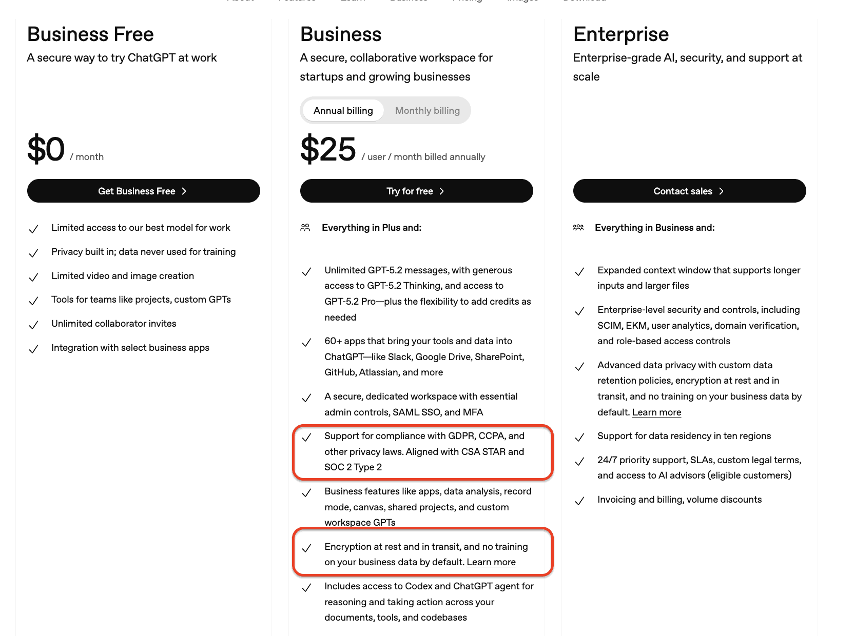 According to ChatGPT’s current plan descriptions, encryption at rest and in transit is available for Business or Enterprise users, but not for any other lower plans.