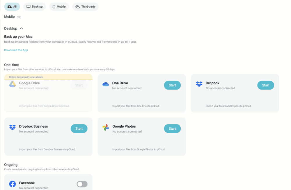 pCloud is predominantly a cloud storage service that also offers online backup features on the side. All your backup data is stored in the cloud, and you can access it across multiple devices, including mobile. Creating a backup is painless — you simply download the desktop app and choose which folders you want to back up continuously to your pCloud account.