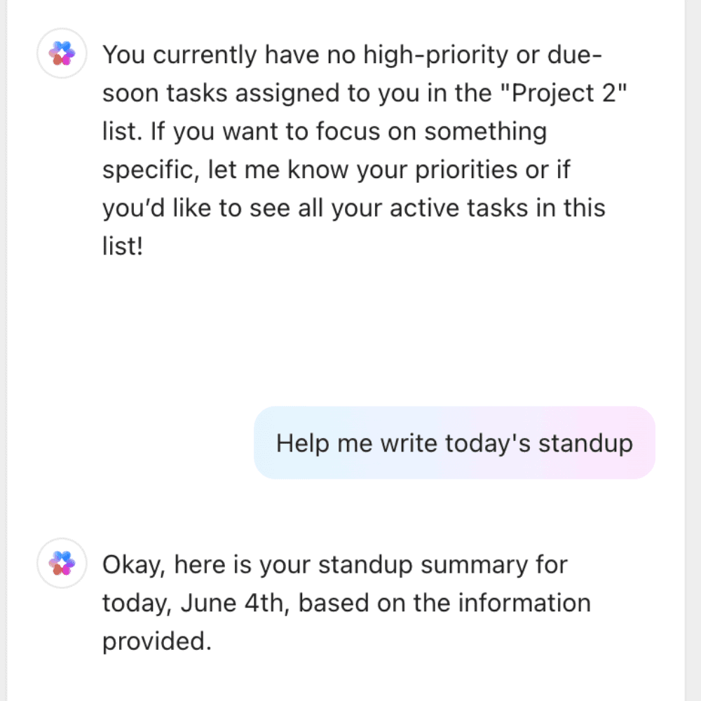 AI is increasingly being integrated into tools to boost project management functionality. It can help you find answers quickly from the context of your tasks or projects, which saves the effort of having to manually dig for information. Moreover, it can help with tasks like building project briefs, auto-filling repetitive data or summarizing meeting notes.