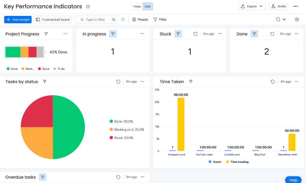 For instance, in monday.com, you can set up a dashboard for key performance indicators (KPIs) such as real-time project progress, task status and time spent on different tasks. The dashboard updates automatically as project teams log their progress. Dynamic reporting like this gives decision-makers immediate insights into where attention is needed most.