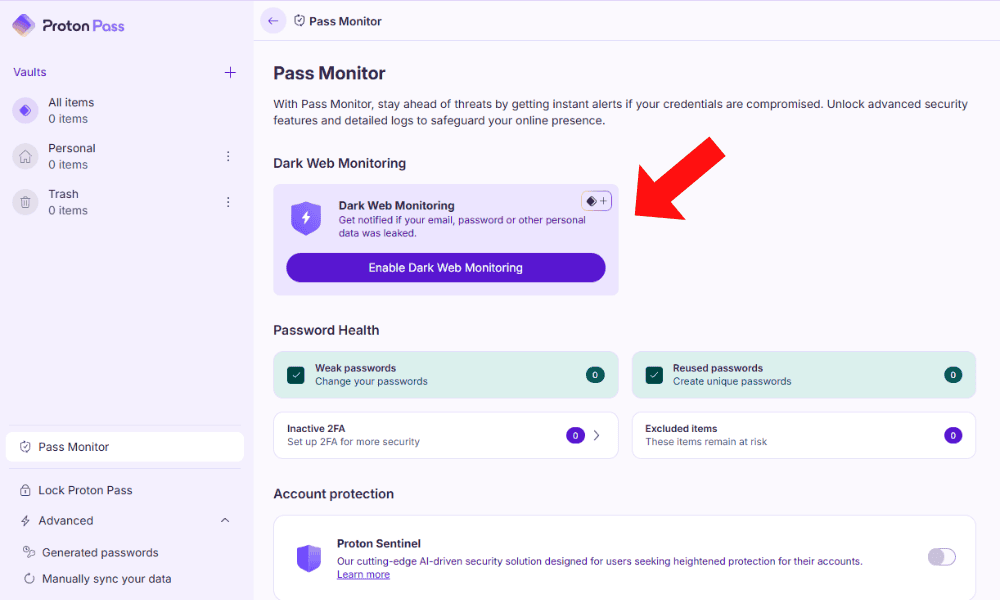 Proton’s main focus is creating software rooted in online privacy, and its password manager is no different. Proton Pass offers effective password management with end-to-end, client-side encryption, as well as an integrated dark web monitor for protection against data breaches.