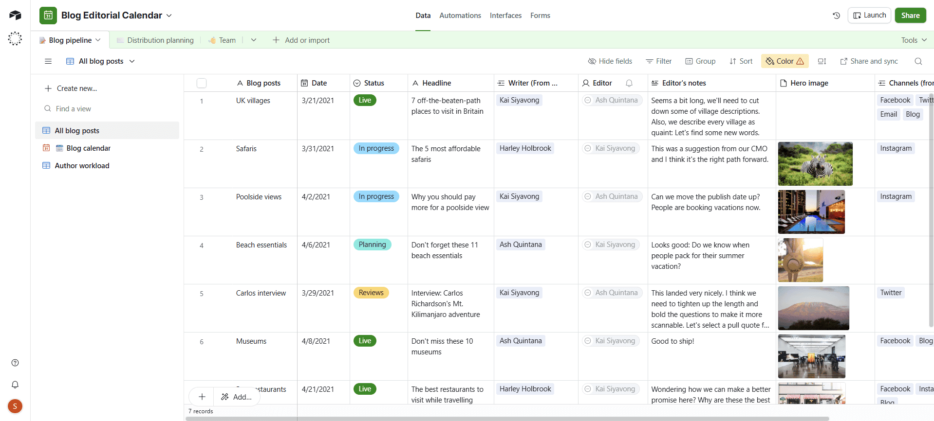 Airtable is a great option for large teams managing SEO campaigns that love spreadsheet systems and structured interfaces. Multiple view options give managers quick insights into projects, deadlines and status. Teams can collaborate in real time, make edits and leave comments.