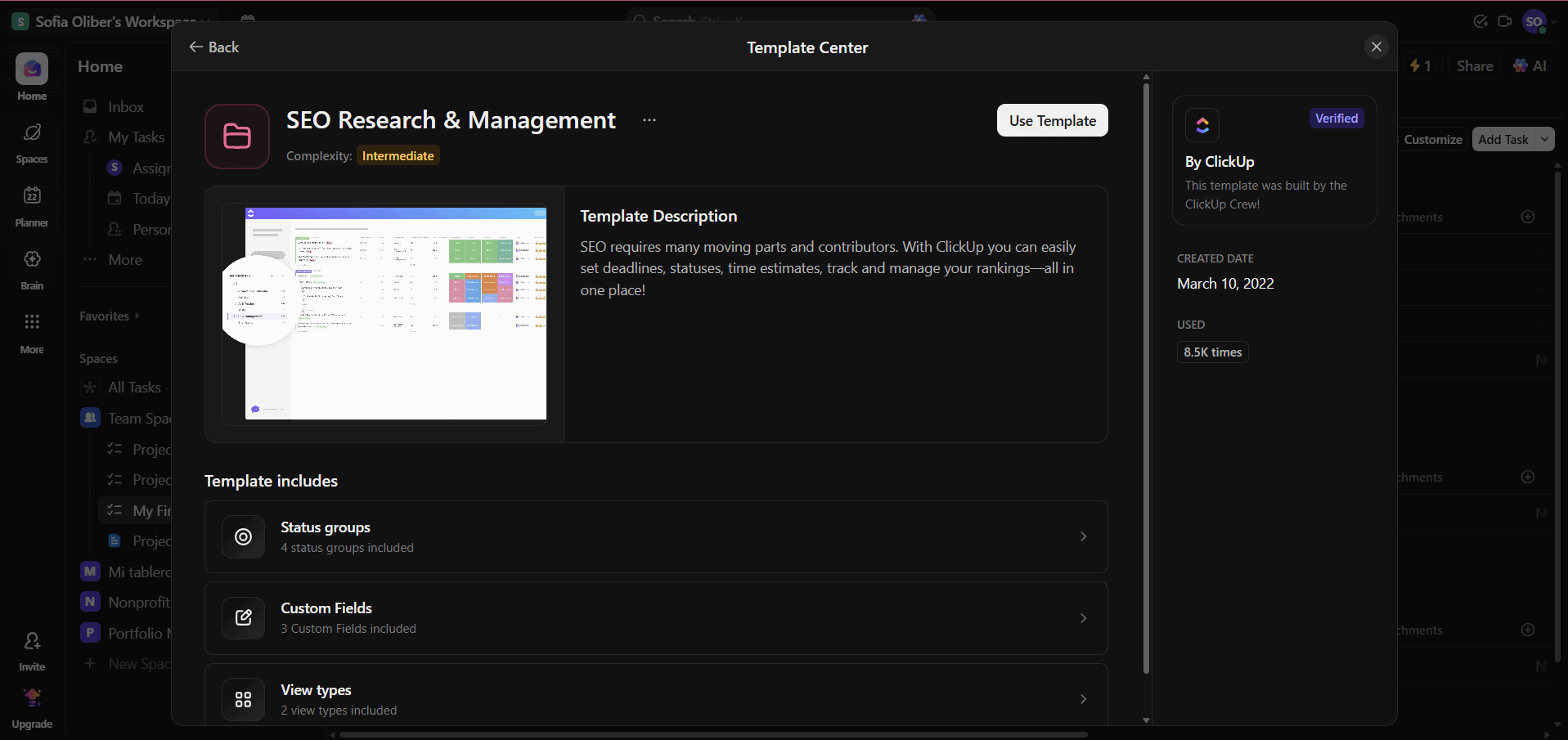 ClickUp combines ease of use with high performance, offering task management, tracking and automation tools for SEO campaigns. It also includes built-in docs, which are great for briefing teams and reduce the need for third-party apps.