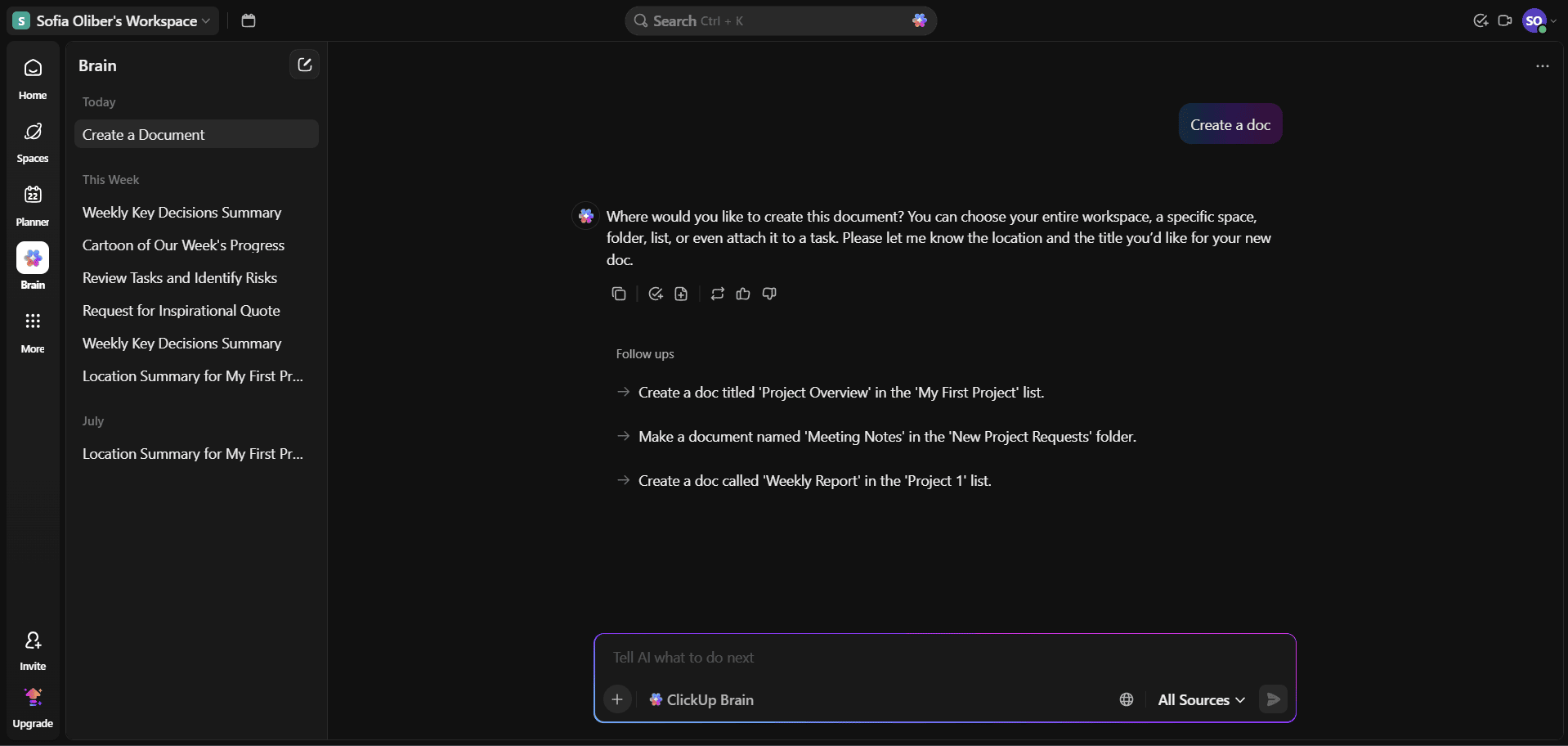 Using ClickUp feels intuitive from the start, with easy-to-scan boards and project templates for competitor link-building analysis. It also has a built-in AI assistant called Brain; you can easily access Brain’s tools from the left-hand menu.