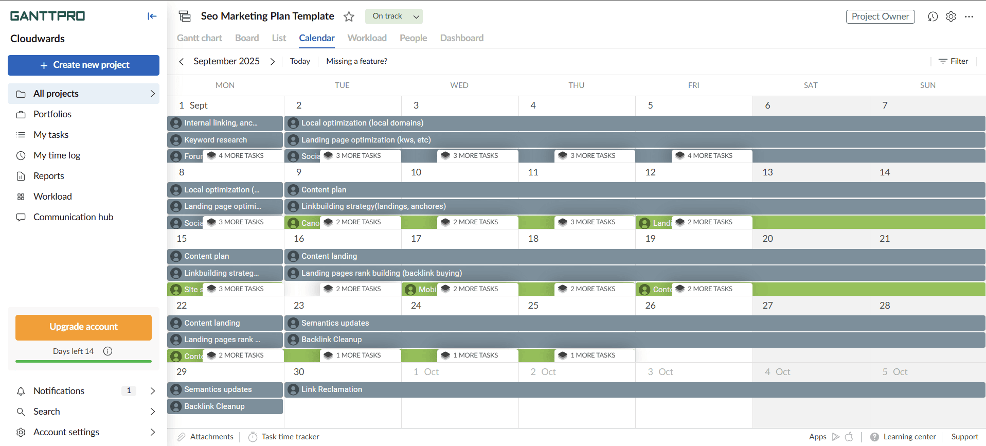 ![]() | 14-day free trial | $8 per month (one-year plan), per user | Focused on dependencies & deadlines | Clean & Gantt-focused | Gantt chart as a calendar, SEO-specific template |