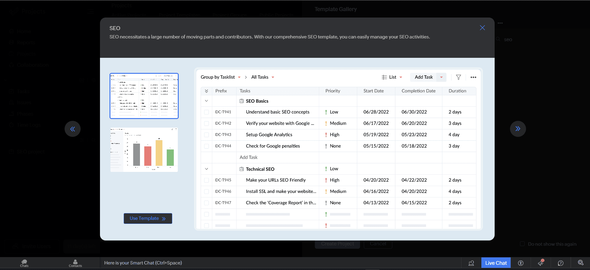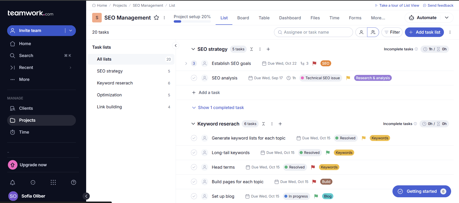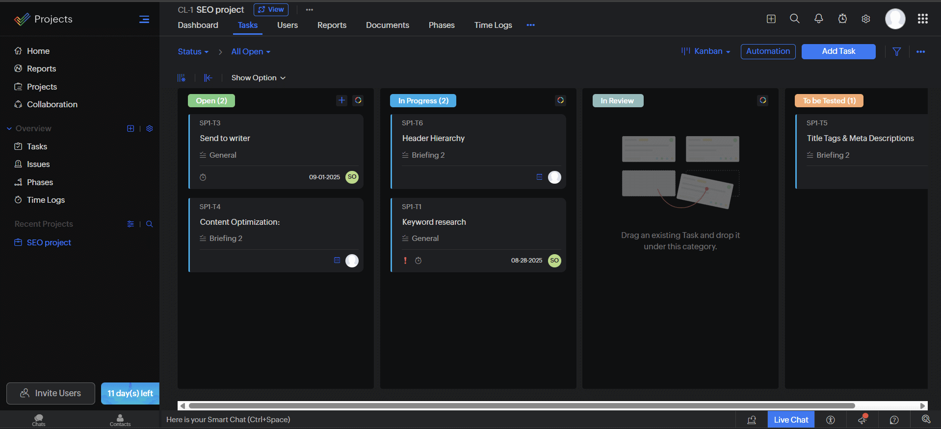 Zoho Projects combines affordability with professional features, making it a great fit for small teams and individual professionals. It includes advanced features like Gantt charts, automations and task tracking for SEO campaigns.