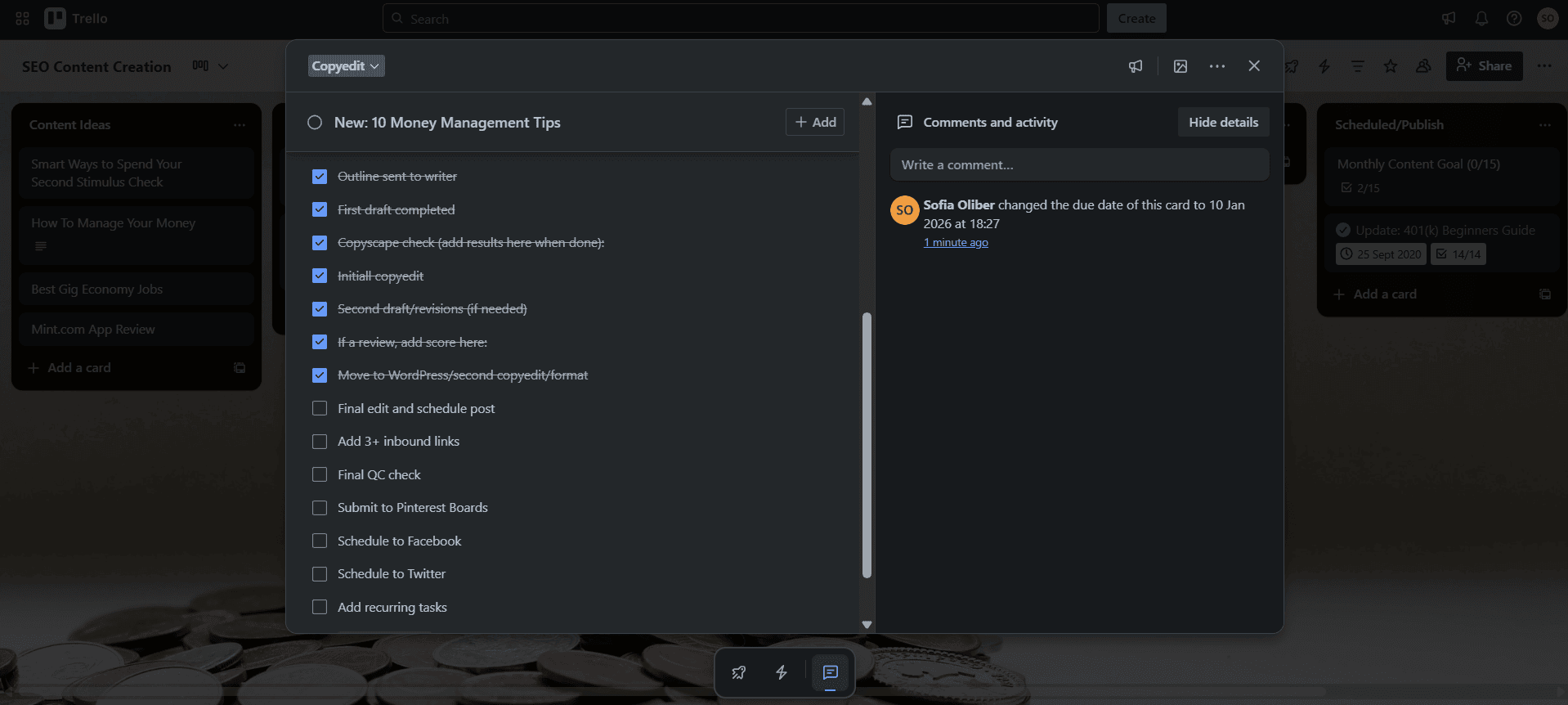 We’re not exaggerating when we say Trello is one of the most user-friendly and visual tools available. Users can drag and drop tasks between columns and leave comments for other team members to read in real time. This simplicity comes with a downside, though: Trello can be too limited for more complex SEO projects.