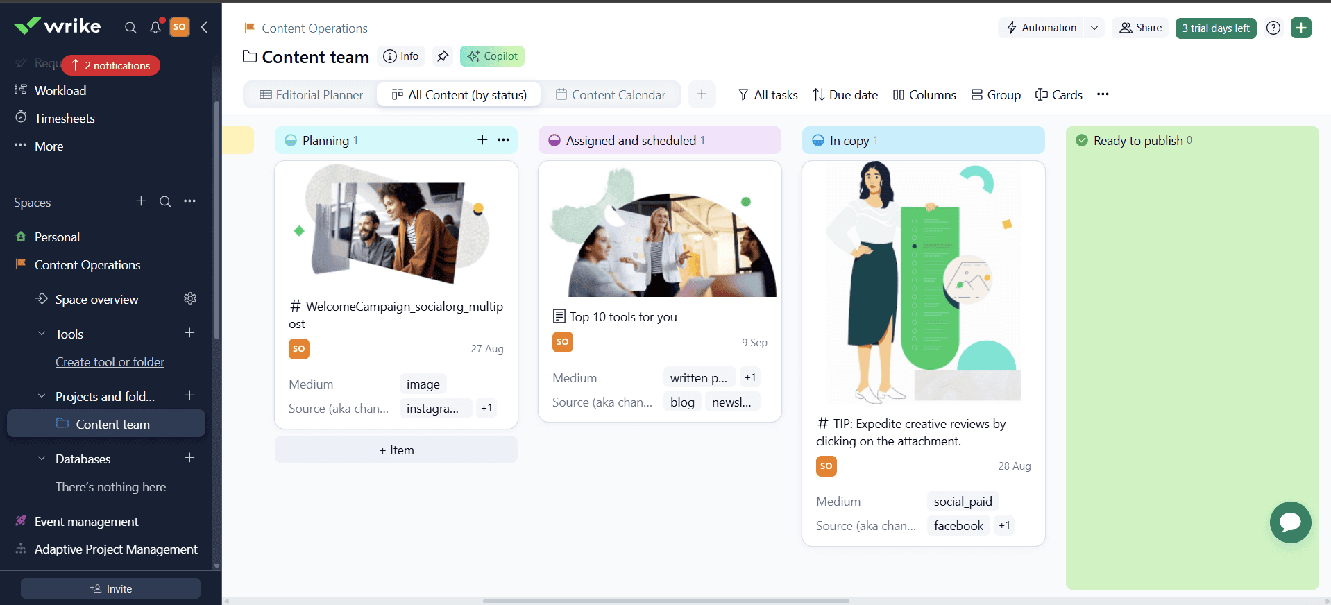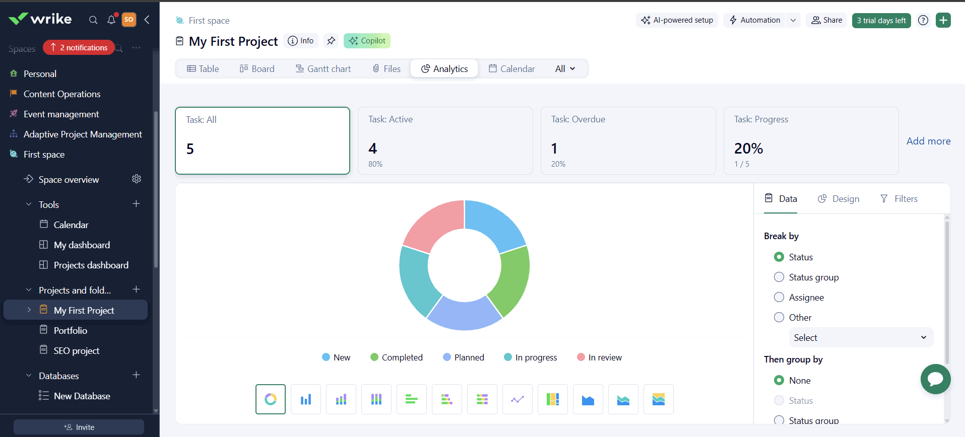 Wrike stands out for its project management features and comprehensive dashboards. Flexible reporting gives teams a clear view of projects, and SEO professionals can build custom workflows that cover every stage of SEO management.