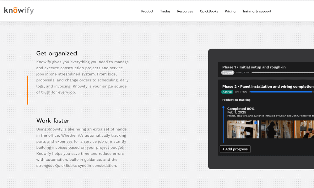 Knowify is a construction field software solution for trade contractors like electricians and plumbers. It simplifies tracking labor, materials and job progress, ensuring accurate estimates and smooth billing. Cost-tracking and reporting features provide real-time insights into profitability while keeping client communication and project updates organized.