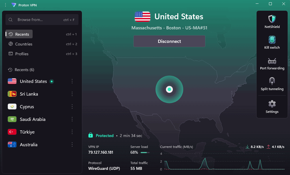 Proton VPN is an excellent choice for streaming ‘Adventure Time’ if privacy is a top priority. Based in Switzerland with a strict no-logs policy verified by independent audits, Proton VPN delivers the security-conscious approach that sets it apart from competitors. It’s one of the most stable choices for U.S. streaming, consistently averaging around 275 Mbps.