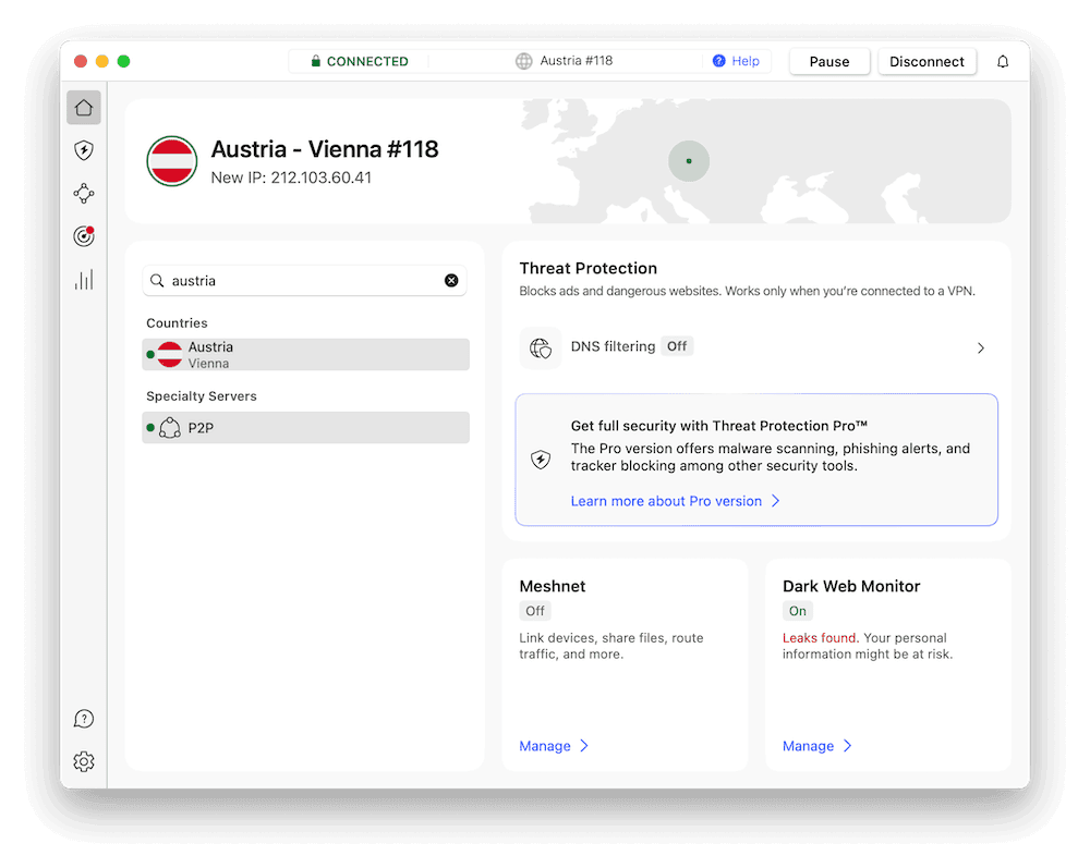 Use the search bar (or map, depending on which device you’re using) to find a server in the U.S. Then, click on it to connect.