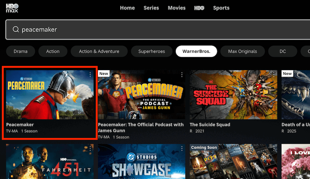 Use the search bar to find ‘Peacemaker‘ and click on the episode you want to start streaming. Remember, season one is available, but season two will arrive at a later date.