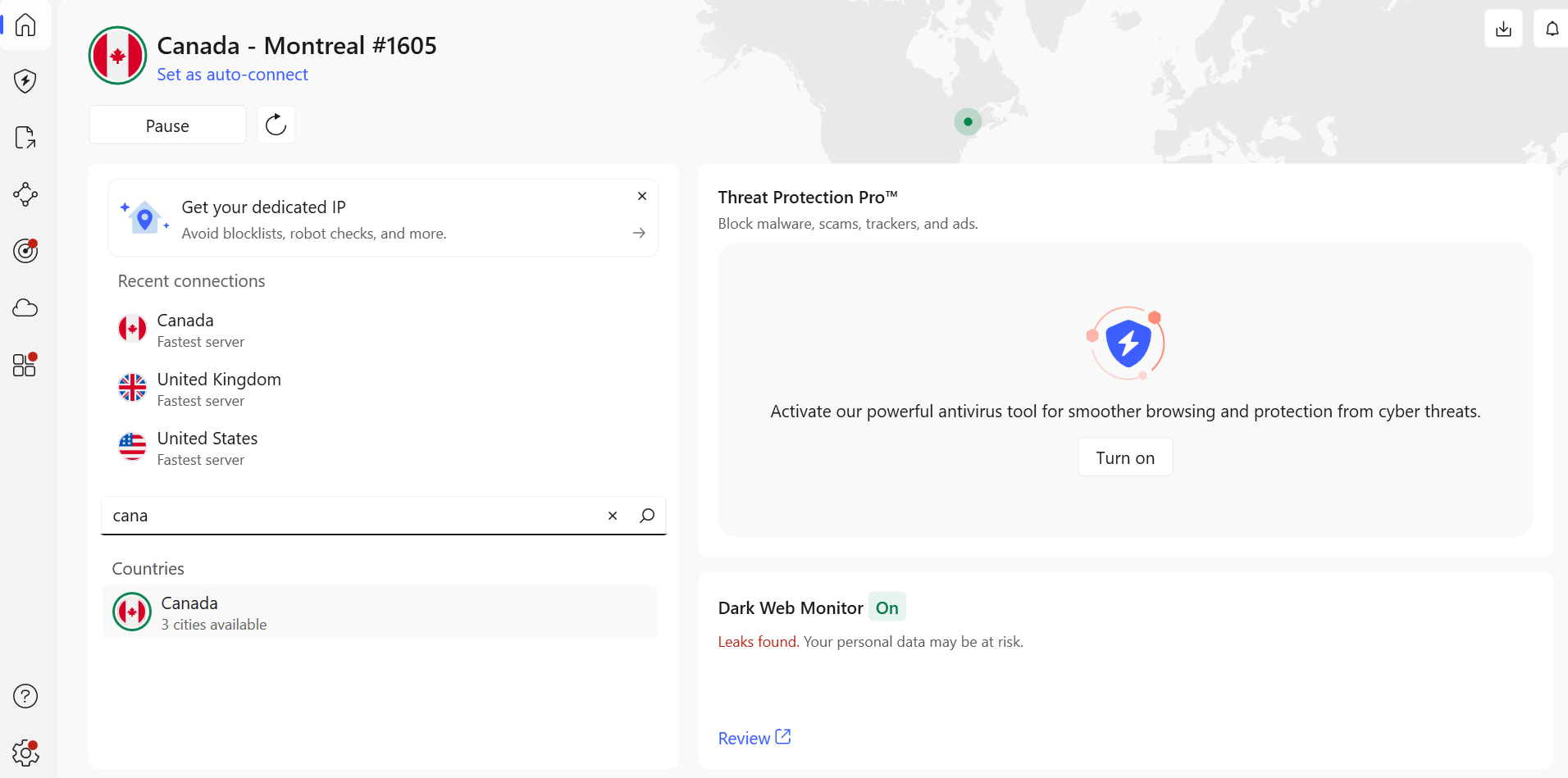 Open NordVPN’s app and search for a server in a country where YouTube’s AI age restrictions don’t apply, like Canada.