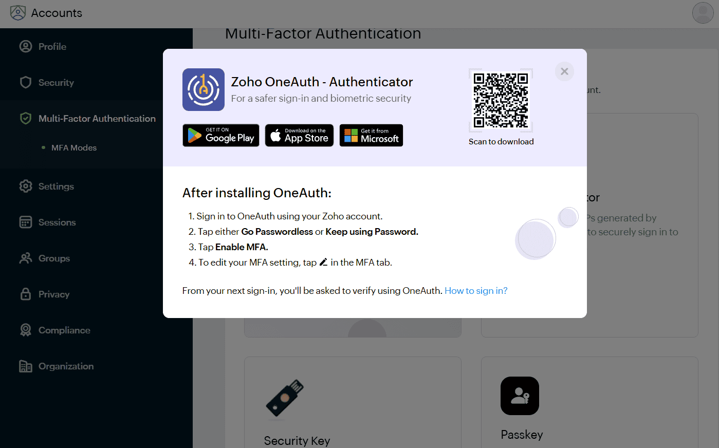 Zoho accounts provide several options for multi-factor authentication (MFA), including authenticator apps (such as Zoho OneAuth), security keys and passkeys. OneAuth even comes with backup codes and a passphrase in case you’re unable to use the app-generated TOTP (time-based one-time password).